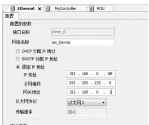 以施耐德PLC端为例,为实现PLC的远程监控,需确保PLC的网络设置正确,并且已经下载到 PLC中,其中包括IP地址、子网掩码、网关地址,三者错一不可。