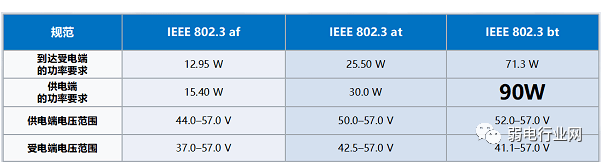 为满足PD设备对更大功率的需求,全新的 IEEE 802.3bt(也称为PoE++或4PPoE)于2018年发布,新标准对先前的 PoE 和 PoE+ 规范做了修订,可将功率水平扩展到90W。