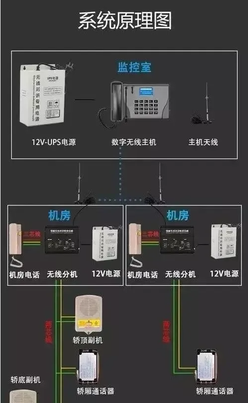 随着电梯大面积的使用,电梯通讯系统也由简单的单电梯紧急呼叫系统发展成为。目前可以大面积联网的多电梯群通讯系统,使得大型小区几十台甚至数百台电梯紧急呼叫系统组网联在一起,组成一个电梯集团通讯系统。在这个系统中,每一台电梯都有一个固定的编码,且每台电梯中的轿箱主机、轿顶分机、底坑分机、机房分机遇到紧急情况都可以与管理中心进行呼叫通话,管理中心也可以与任一台电梯中的轿厢主机、轿顶分机、底坑分机、机房分机进行呼叫通话。并可以进行群呼和广播式通话。