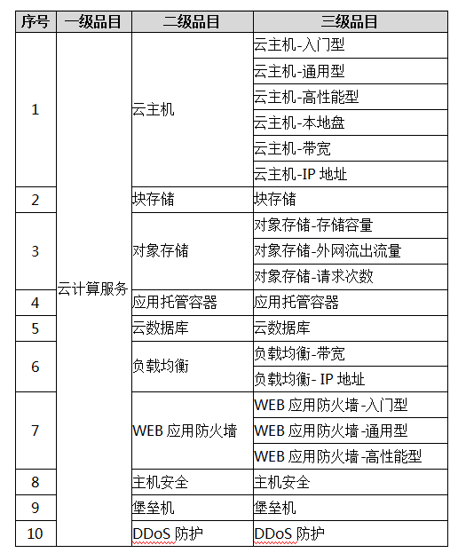 采购需求:云计算服务,具体品目包括云主机、对象存储、块存储、负载均衡、WEB应用防火墙、应用托管容器、云数据库、主机安全、堡垒机、DDoS防护。
