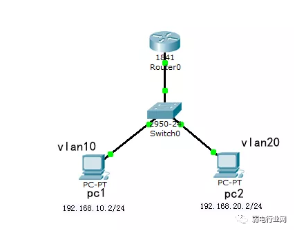 pc1与pc2已经不在同一vlan中,pc1属于vlan10,pc2属于vlan20,那么pc1如何与pc2通信呢?需要使用路由功能,这里面就有两种实现方法,一种是单臂路由,一种是三层交换机;这里面我们就以单臂路由的方式来实现pc1与pc2通信。如下图所示:以思科交换机为例。