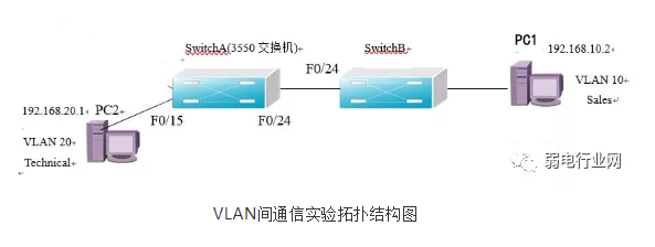 S3550-24(三层交换机)1台、S2126交换机1台、pc1在vlan20里,pc2在vlan10里,如下图所示。