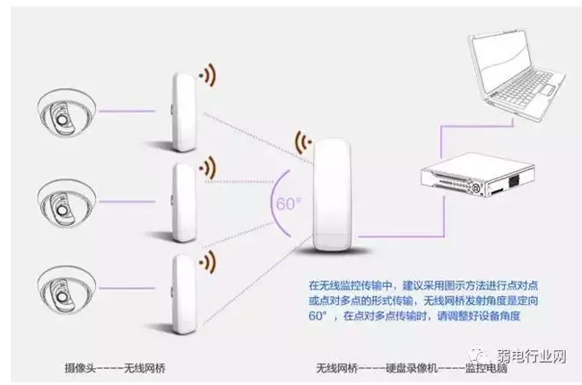 如果摄像头分布的位置到监控中心形成的夹角小于60度,可考虑点对多点传输。可以减少发射端网桥和成本。