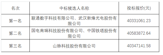 中标候选人第一名:联通数字科技有限公司、武汉新烽光电股份有限公司