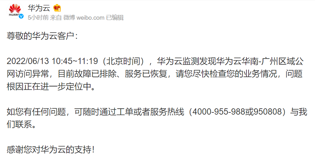 尊敬的华为云客户:2022/06/13 10:45~11:19(北京时间),华为云监测发现华为云华南-广州区域公网访问异常,目前该故障已恢复,请您尽快检查您的业务情况,问题根因正在进一步定位中。如您有任何问题,可随时通过工单或者服务热线(4000-955-988或950808)与我们联系。感谢您对华为云的支持!