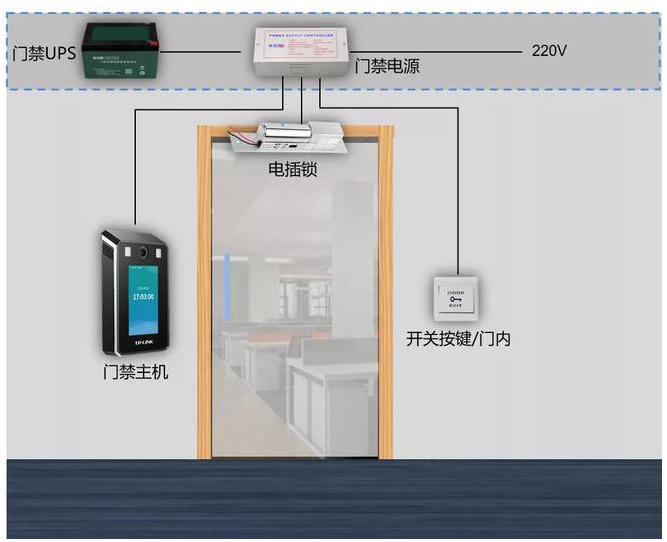 针对玻璃门等场景,双向开门(内开/外开)一般会选择电插锁,门禁设备线路连接图和组合推荐如下: