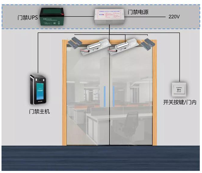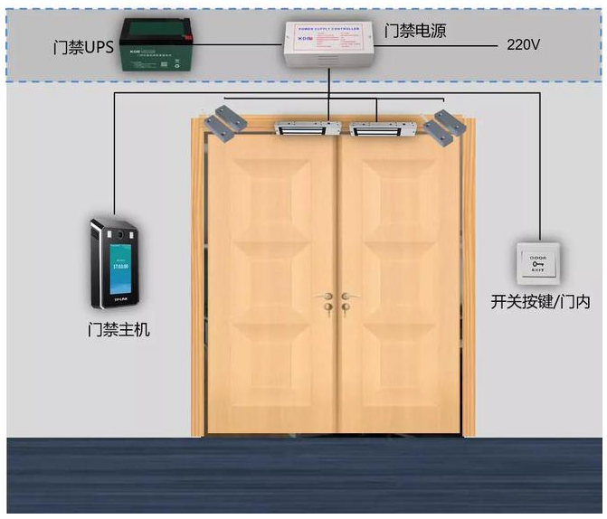 对于办公场景、重要输出口双木门或铁门,需支持内开方式,门禁设备线路连接图和组合推荐如下: