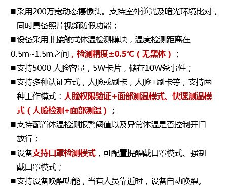测温人脸识别终端是一款人脸识别类门禁考勤一体化产品。集成人员身份验证及体温检测模 块,采用非接触式测温实现体温快速检测,人员身份信息与体温数据关联汇聚中心有效保障 防控安全,可广泛应用于企业、车站、园区、场馆、工厂等场景,实现人员权限管理及体温监控,满足保障防疫防控要求。