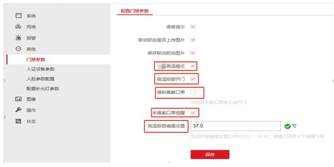 体温超标禁止开门:开启后,检测到温度高于或低于配置的阈值时,门不开启。默认开启。