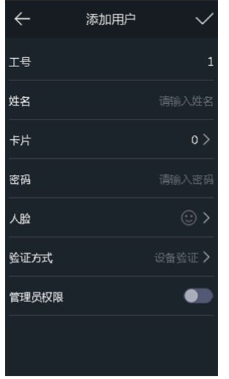 点击+进入添加用户界面,点击工号,可编辑新增用户工号。点击姓名,并输入新增人员姓名。