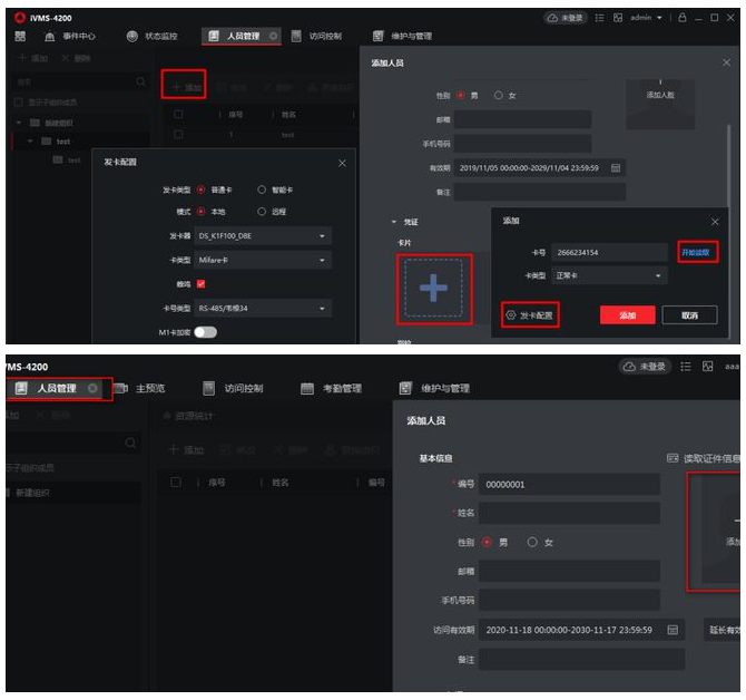 点击卡号并添加卡片信息。输入卡号或在设备的刷卡位置刷卡读取卡号。