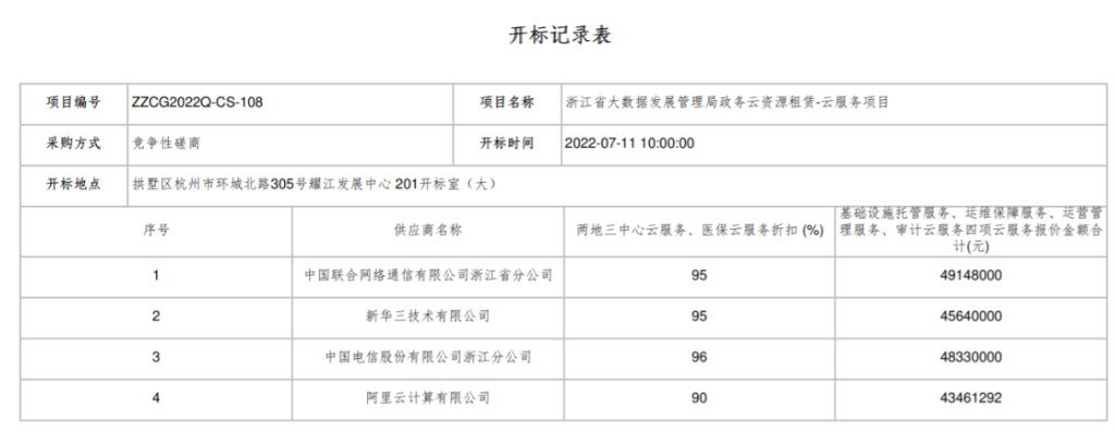 新华三、中国电信、中国联通落标!4346万元,阿里云中标浙江省政务云资源租赁-云服务项目