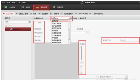打开4200客户端软件,打开事件管理模块,选择事件类型,进行配置,比如越界侦测功能,启用勾选,设置好布防时间,联动监控点,布防区域绘制警戒线,选择警戒线方向等参数。