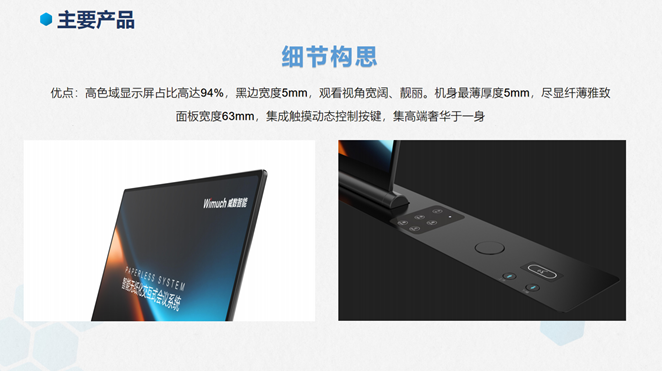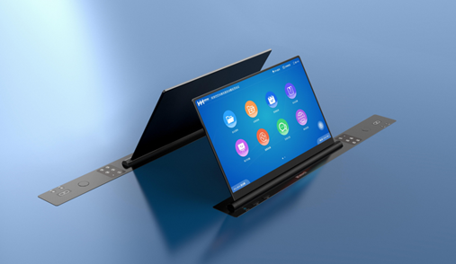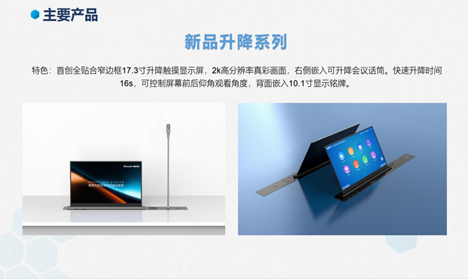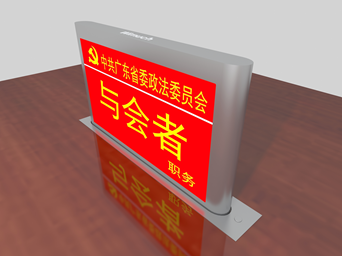 主席桌采用(图二)先进的15.6寸无边框全贴合快速升降显示屏作为电子文件阅读终端,框架边缘黑边小于5mm,视觉效果更旷阔。采用新型压铸加工技术,机身最薄5mm,单程升降时间15s。可通过触摸升降按键控制屏幕的升降和符合人体工学前后仰角的最佳视角。右侧集成可升降高质量拾音话筒,触摸激活发言功能,有效拾音距离可达50cm,整体提升会议高效交互性和美观性。配备(图三)7寸升降电子桌牌,有效呈现不同参会人员身份信息。二者均可同步升降或控制单独升降,满足多元化多场景会议使用要求。