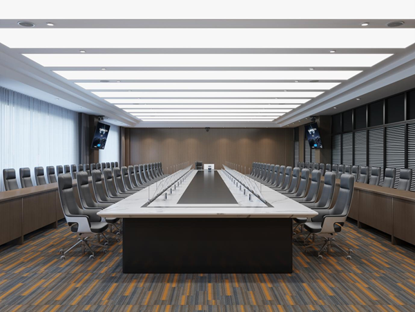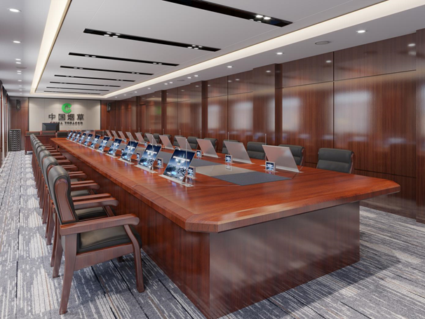 作为现代化多媒体会议室建设的一级执行标准,无纸化会议是集LED大屏显示、数字会讨发言、音频音响扩声、设备集中控制管理及无纸会议系统等多种先进技术于一体的智能化系统集成。桌面升降式发言系统设计,保留了拾音距离长、指向性明确的特色,增加了会议室多用的可塑性。专业的扩声系统搭配,解决了高质量会议存在的声音失真、串音等声学瑕疵。毫无缺陷的还原与会者声音传输,大幅度提高了系统的稳定性。中央矩阵控制系统能有效的把各个子系统有机的连接起来,通过平板一键式操作,既能做到控制声光电的协调性,远程视频无缝协同办公操作。又能合理进行多会议人员安排,把所有信息数字化、简约化,提高会议的舒适性及办公效率。
