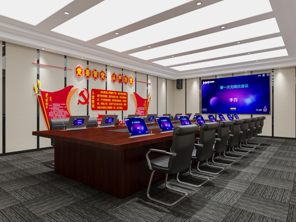传统会议过程中突发的各种需求问题,在管理人员频繁解决问题的同时,极易打乱会讨节奏。无纸化系统既能拓展中央控制系统,能有效的把各个子系统有机的连接起来,通过平板一键式操作,既能做到控制声光电的协调性,远程视频无缝协同办公操作。又能合理进行多会议人员安排,把所有信息数字化、简约化,提高会议过程的舒适性及办公效率。