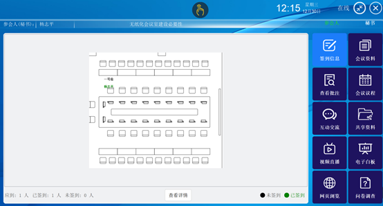 l 显示当前会议室的座位布局,人员到会情况,以及参会人员的信息及签到统计。