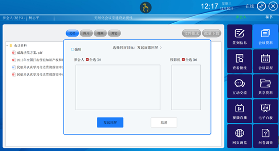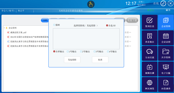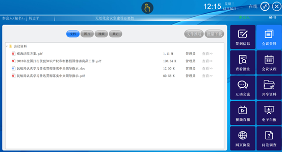 智能无纸化会议系统作为现代化多媒体会议室建设的一级执行标准。单位日常需要组织和决议的会议也越来越多。无纸化会议系统的运用很好的解决了这个问题,可对会议室进行分时间段不同的会议安排。一键导入相关的会议议题以及参会人员,设置不同部门的阅读权限。会中秘书端可辅佐领导桌面同屏近距离一对一交流,让会议变得井然有序,丰富多彩。