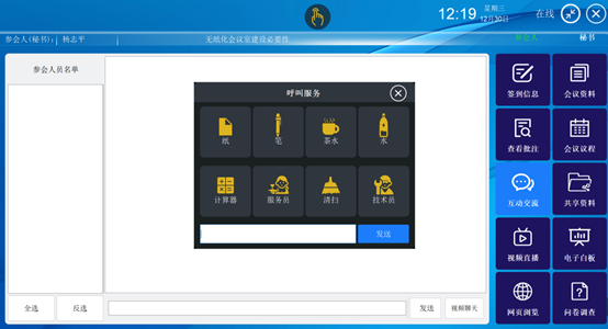 传统会议的召开往往需要配备文件打印员、茶水员、会议管理员等。无纸化系统仅需后台一人统一部署上传会议所需的资料,手机APP一键查收茶水服务通知。为决策会议讨论重要文件及研究其他工作问题提供全方位的智能保障。同时节省人力资源大力发展集团其他事务。