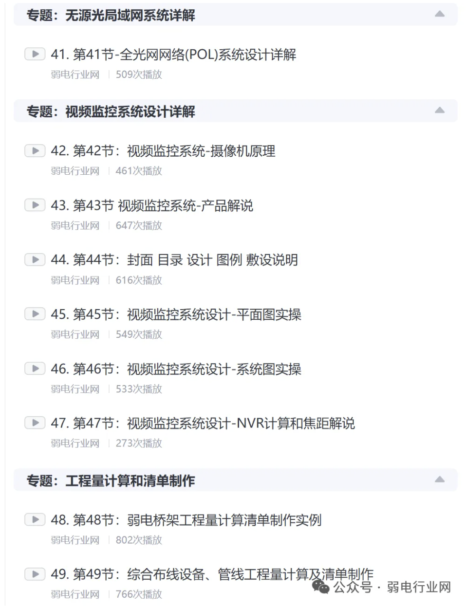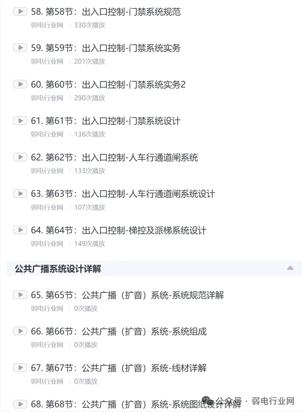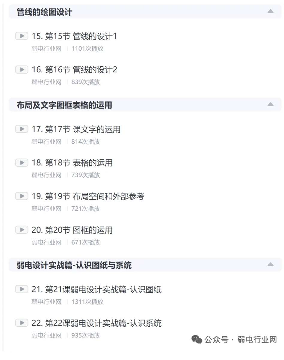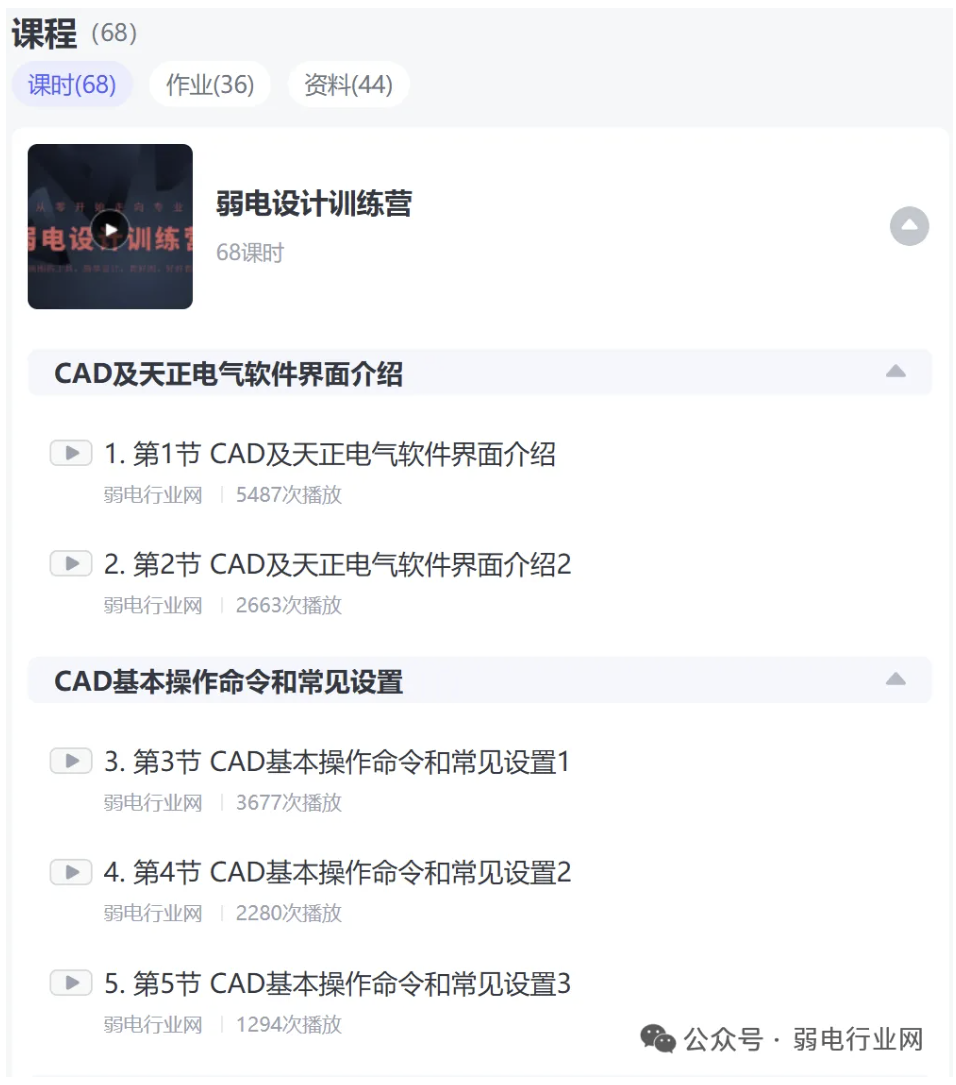 课程非常全面,共68节,从基础到深入到案例讲解弱电设计,系统的讲解了弱电设计步骤要点和项目实际操作技术, 非常适合施工人员、设计师、项目经理、利用弱电设计赚钱的人、弱电图纸接触的人员等 。