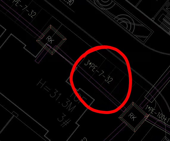 在图纸上面看到这个3*pe-7*32的梅花管,这个是什么意思呢?有不少朋友遇到这个问题。其实这个就是表示3根7孔32mm的pe梅花管,这个标的非常详细。