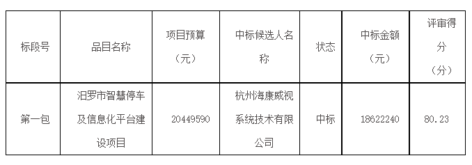 海康威视:1862万中标湖南省汨罗市智慧停车及信息化平台建设项目(附采购清单)