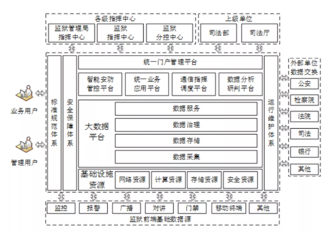 内蒙古自治区“智慧监狱”第一期建设工程,基于物联网、大数据、人工智能和无线宽带通信等技术,全面接入全区各监狱监控、报警、广播、对讲、门禁、移动终端等前端基础设施数据,同步监狱管理局指挥中心、监狱指挥中心、监狱分控中心融合指挥调度管理数据,与外部单位进行数据交换,建设内蒙古监狱系统大数据平台,围绕监狱系统各类业务应用需求,建立通过统一门户管理平台进行登录、访问监狱系统各类业务应用系统,服务全区各级业务用户和管理用户,并向上完成与司法部、司法厅的数据上报和业务办理,推动“智慧监狱”各信息化系统在监管改造和安防应急等工作中的应用,实现“向科技要警力,向大数据要战斗力”的信息化建设效果。