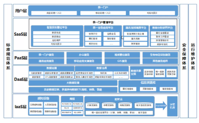 参照国家电子政务有关规范和云计算技术架构分层描述的基本方法,将内蒙古自治区“智慧监狱”总体结构归纳为5层次和3大体系,即“五层三体系”,5层次分别为IaaS层、DaaS层、PaaS层、SaaS层和用户层,3大体系分别为标准规范体系、安全保障体系和运行维护体系。