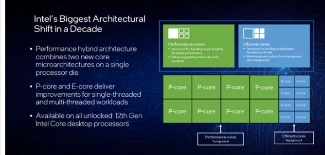 12代酷睿设计了两种CPU核心,一个是性能核(P核),一个是能效核(E核)。