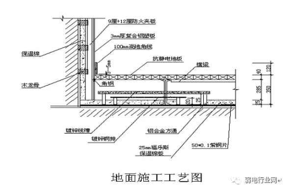 首先要在地板的下方先铺设一层铜泊,用于和地板的充分接触,其次就是把铜泊铺设到墙边时,汇集几个点接到接地线上(三到五个点最佳,防止在使用中有点的断开),接地线的另一端要连接一个接地柱,接地柱最好能埋在地面50CM以下的深度,这样才能使地板起到静电释放的作用!结合布线系统的设计及施工,在地面架空安装强弱电走线线槽及接地铜排,强弱电走线线槽之间间距大于30mm。在地面铺设和地板下四周墙面铺设25mm厚阿姆斯壮一级福乐期保温棉,包福乐斯不燃铝箔,起到保温、隔热、防潮作用,至此,地面预处理完成。