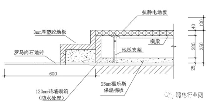 进入机房架高地面的踢脚台应具有防水隔潮、美观大气、坚固实用等特点,本项目中,可以使用120mm砖墙砌筑以隔离机房架高地面,设一级台阶,台阶的宽度以300mm为宜,以砌素砼而成,根据实际需要,在台阶表面铺设防水材料,如大理石、丁纹钢板、塑胶地板等。