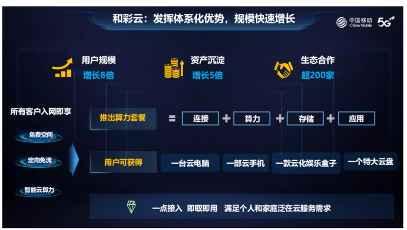 作为信息基础设施的建设者,中国移动近期将推出算力网络套餐,和彩云也正在实现从云盘向算力服务升级,打造个人和家庭泛在云服务,让用户享受科技创新的红利。用户在体验 5G、千兆宽带连接的基础上,还可以申请算力、存储以及多种应用,形象来说,就是用户可以申请一部云手机、一部云电脑、一个云娱乐盒子、一个特大云盘,通过和彩云一点接入、即取即用。
