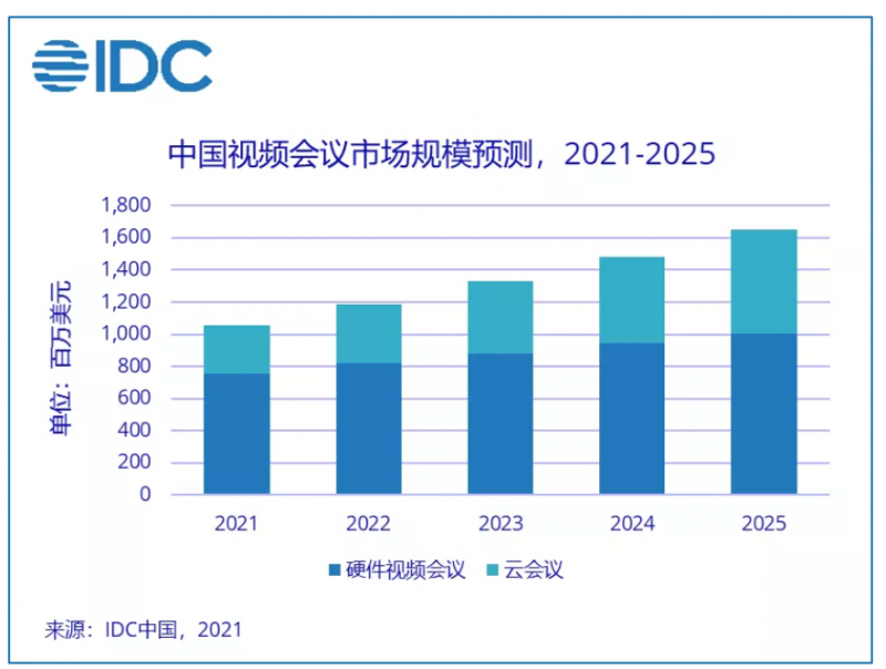 2021年12月1日,IDC最新发布的《2021上半年IDC中国视频会议与协作市场跟踪报告》显示,2021上半年,中国视频会议市场规模达到4.4亿美元(约合28.3亿元人民币),市场规模同比上涨8.6%。
