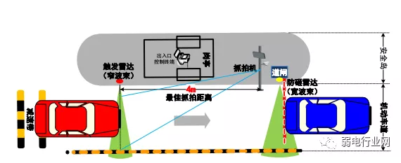 道闸雷达由“触发雷达”和“防砸雷达”两部分组成。触发雷达用于监控车辆到来, 触发抓拍机抓拍车牌,控制自动闸杆升起;防砸雷达用于监控车辆离开,控制自动闸 杆升降,防止“砸车”、“砸人”事故发生;应用场景如下图: