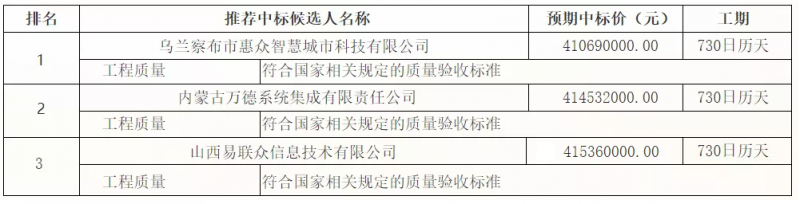 日,内蒙古乌兰察布市智慧集宁项目中标候选人公示,中标候选人第一名 :乌兰察布市惠众智慧城市科技有限公司,预期中标价:41069万元。乌兰察布市惠众智慧城市科技有限公司为:山西清众科技股份有限公司、内蒙古网讯信息工程有限公司、乌兰察布市集宁区智明惠通信息科技有限责任公司三家企业合资公司。