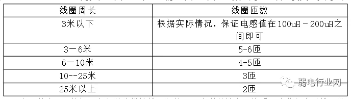 为了使检测器工作在最佳状下,线圈的电感量应保持在100uH-300uH之间。在线圈电感不变的情况下,线圈的匝数与周长有着重要关系。周长越小,匝数就越多。一般可参照: