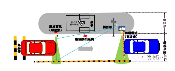道闸雷达由“触发雷达”和“防砸雷达”两部分组成。触发雷达用于监控车辆到来, 触发抓拍机抓拍车牌,控制自动闸杆升起;防砸雷达用于监控车辆离开,控制自动闸 杆升降,防止“砸车”、“砸人”事故发生;应用场景如下图: