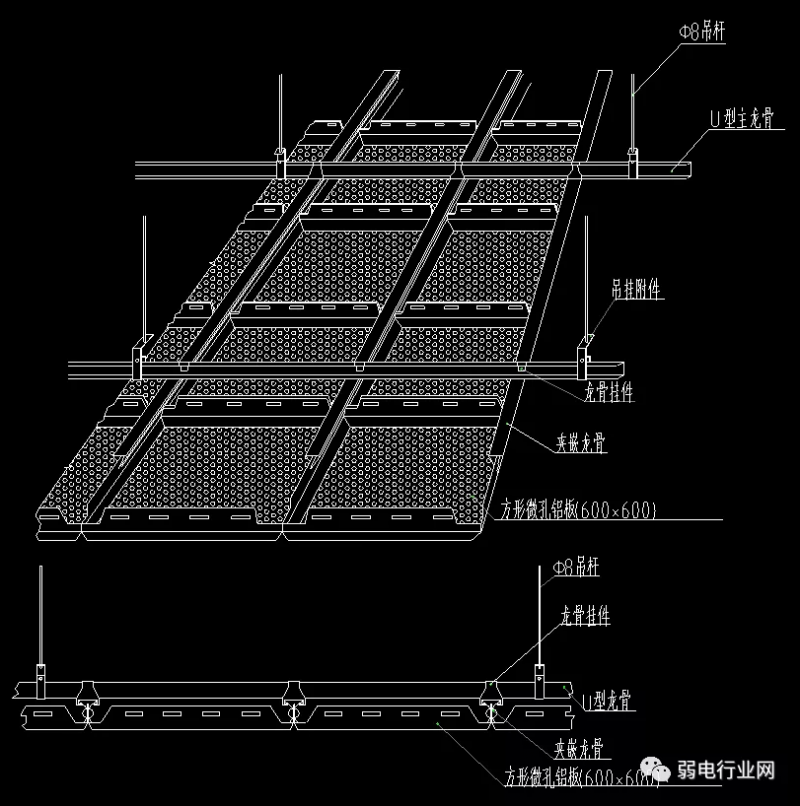 为使铝合金微孔板吊顶在完成后达到平整、不变形的效果,在施工中应杜绝使用镀锌铁丝作为受力吊杆。规范做法:是在铝合金微孔天花主龙骨通过F6或F8钢筋直接固定在钢筋混凝土楼板上。