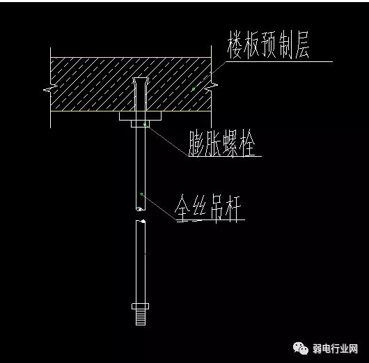 b、用膨胀螺栓将吊杆固定到结构顶棚上,固定应结实牢固;吊杆间距应满足设计要求,不应大于1200mm。