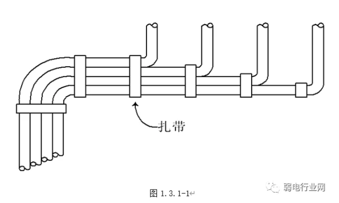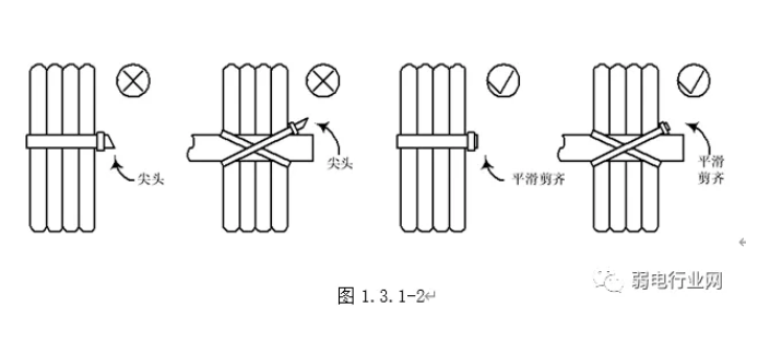 扎带在使用时,应视不同的情况使用不同规格的扎带,尽量避免使用两根或两根以上的扎带连接后并扎,以免绑扎后强度降低,扎带扎好后应将多余部分齐根平滑剪齐,在接头处不得带有尖刺,如图1.3.1-2所示。