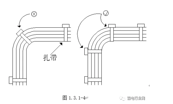 绑扎成束的电缆转弯时扎带应扎在如图所示的位置以避免在电缆转弯处应力过大造成的内芯断芯的故障。见图1.3.1-4。
