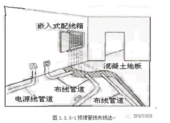 所谓预埋管线布线就是将金属管或阻燃高强度PVC管直接预埋在混凝土楼板或墙体中,并由电信间向各信息插座辐射,如图1.3.5-1所示。
