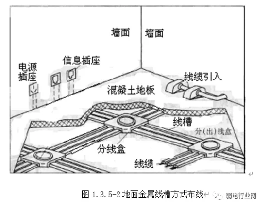 所谓地面金属线槽方式就是将长方形的线槽安装在现浇楼板或地面垫层中,每隔4~8m拉一个过线盒或出线盒(在支路上出线盒起分线盒的作用),直到信息点出口的出线盒。这种方式就是将电信间出来的缆线沿地面金属线槽布放到地面出线盒,或由分线盒引出支管到墙上的信息插座,如图1.3.5-2所示。