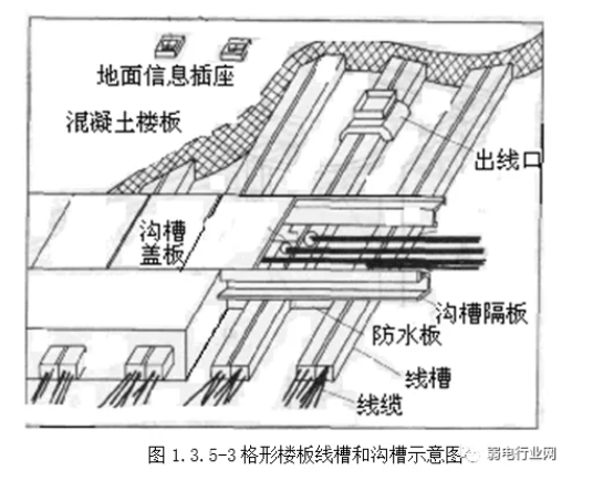 格形楼板线槽与沟槽相结合布线是指,将格形楼板线槽与沟槽连通成网,沟槽内电缆为干线布线路由,分束引入各预埋线槽,在线槽的出线口处安装信息插座,如图1.3.5-3所示。
