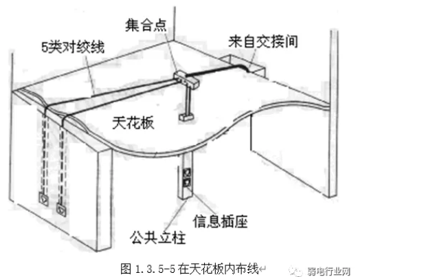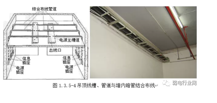 吊顶内布线是指先走吊顶线槽、管道,再走墙体内暗管的布线方式,常用于大型建筑物或布线系统较复杂的场所,如图1.3.5-4所示。