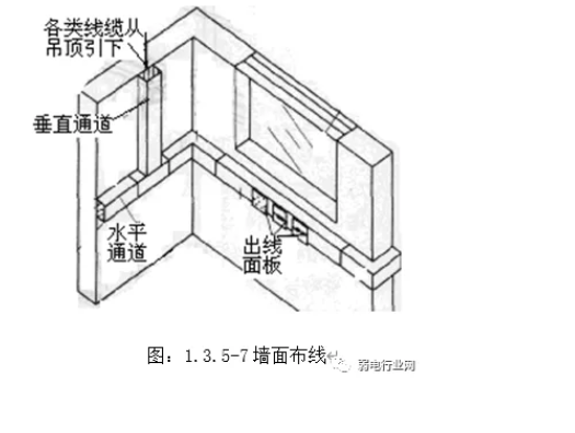 由管道或线槽、缆线交叉穿行的接线盒、电源和出线盒及其配件组成墙面布线系统,如图:1.3.5-7所示。