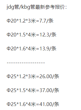 整体来说JDG20管的价格与厚度与型号有关,越厚越贵,一般的话材料最少要3米左右一米,所以一起包工包料的话,综合单价在10元左右一米,包括施工,纯施工的话在5-10元左右,这个还得看地方,一线城市的话要贵30%左右,因为人工费贵。