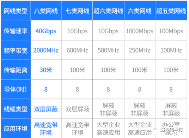 超六类或6A(CAT6A):传输频率是500 MHz,最大传输速度也可达到1000 Mbps,主要应用于千兆位网络中。超六类线是六类线的改进版,同样是ANSI/EIA/TIA-568B.2和ISO 6类/E级标准中规定的一种非屏蔽双绞线电缆,在串扰、衰减和信噪比等方面有较大改善。