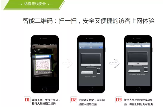 ● 方便易用:“连接无线+扫一扫”,两步就能完成访客上网认证