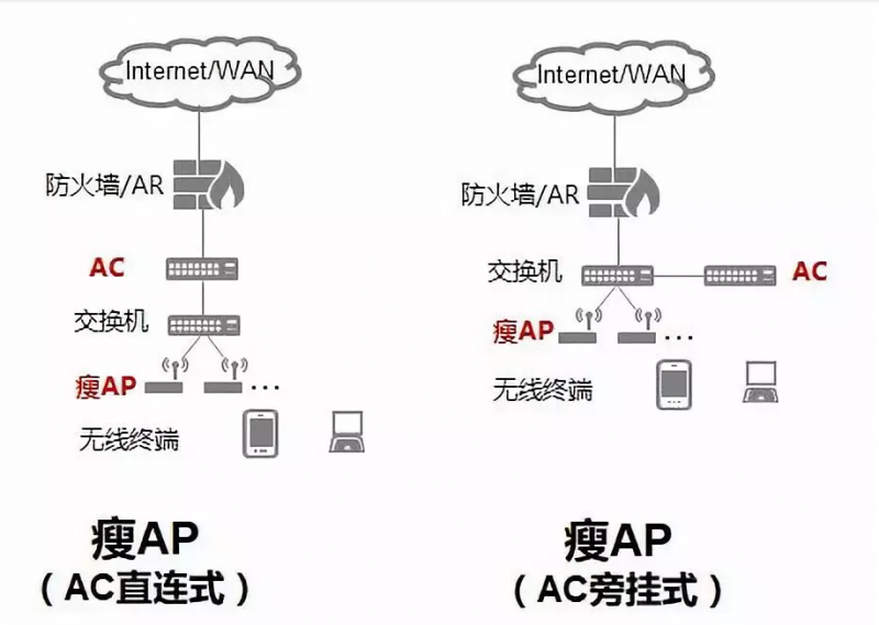 痩AP则是不带管理功能的,简单可以把它理解为一个信号发送与接收的天线,它的管理功能由后端的,我们叫无线控制器(AC)来完成。
